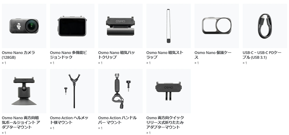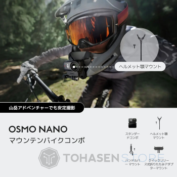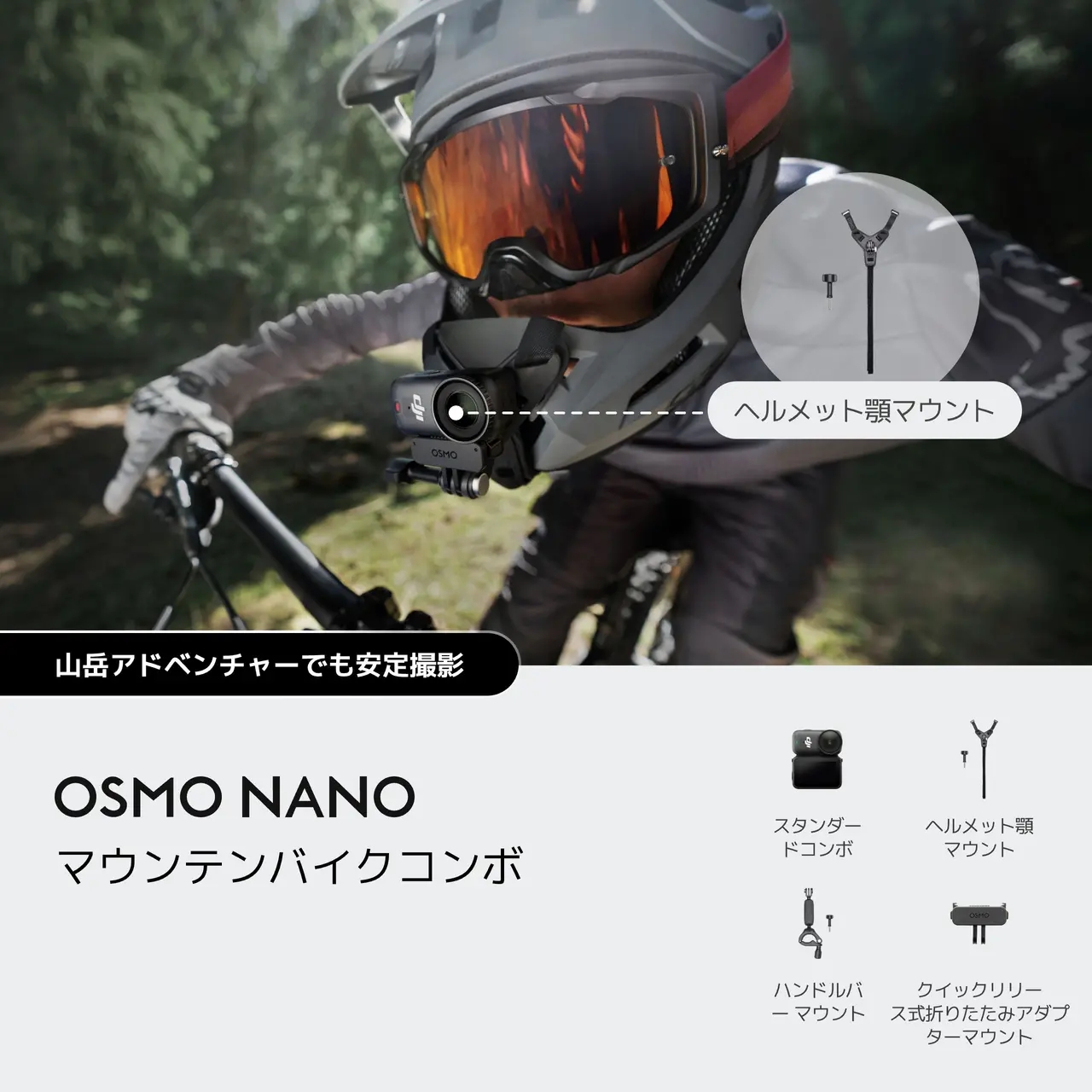 マウンテンバイクコンボ128GBの内蔵ストレージにより、撮影時間を延長でき、人生の最高の瞬間をより多く記録できます。さらに、ヘルメット顎マウント、ハンドルバーマウント、クイックリリース式折りたたみアダプターマウントが含まれています。山道に最適で、でこぼこした道でも安定した多角度の映像を提供します。 【1】Osmo Nano スタンダードコンボ (128GB) (6937224115453 税抜¥44,300)x1 ----Osmo Nano カメラ (128GB) ----Osmo Nano 多機能ビジョンドック ----Osmo Nano 磁気ハットクリップ ----Osmo Nano 磁気ストラップ ----Osmo Nano 保護ケース ----USB-C - USB-C PDケーブル (USB 3.1) ----Osmo Nano 両方向磁気ボールジョイント アダプターマウント ----DJIロゴステッカー ----クイックスタートガイド ----免責事項 ----保証書 ----※電源アダプタは付属しておりません。 【2】DJI Osmo Action ヘルメット顎マウント Helmet Chin Mount(6941565945150 税抜¥2,000)x1 【3】DJI Osmo Action ハンドルバー マウント Handlebar Mount(6941565945075 税抜¥5,400)x1 【4】DJI Osmo 両方向クイックリリース式折りたたみアダプターマウント Dual-Direction Quick-Release Foldable Adapter Mount(6937224120457 税抜¥5,200)x1 ![]() |