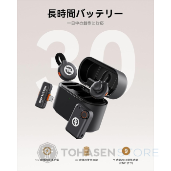 動作時間 | 送信: 約9時間 カメラバージョン 受信: 約8.5時間 モバイルバージョン充電ケース: > 2台の送信機を同時に2回充電 コンボバージョン充電ケース: > 送信機と受信機を同時に2.5回充電 |